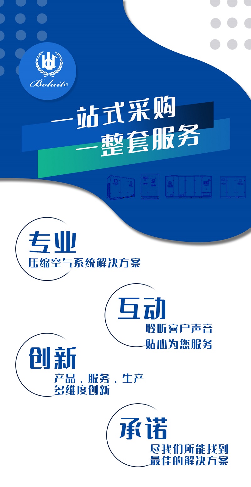 博萊特壓縮機(jī)整體解決方案包括:空壓機(jī)、集中控制系統(tǒng)、儲(chǔ)氣罐、干燥機(jī)、